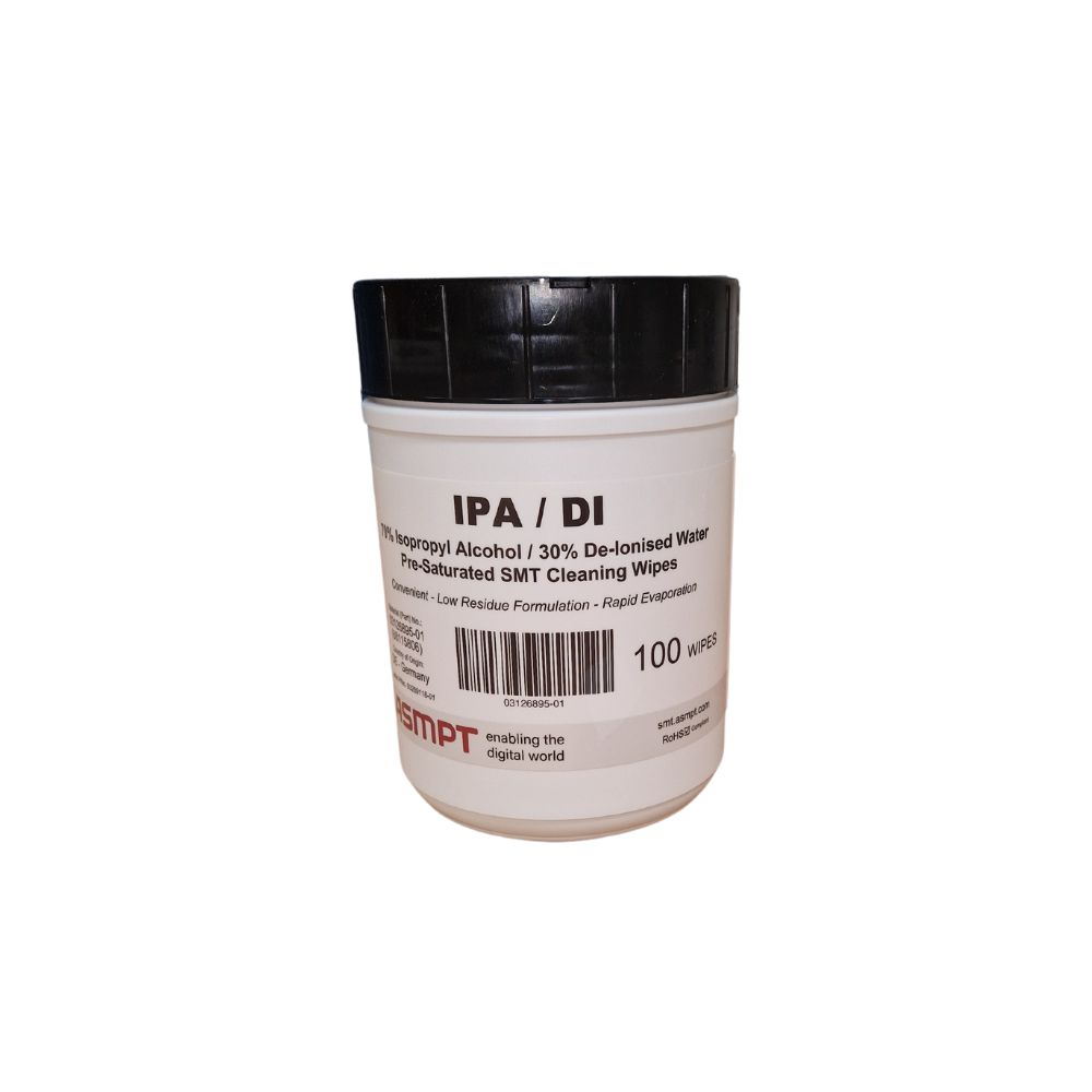 - Lingettes pré-imprégnées d’alcool Isopropylique (IPA) 70% et d’eau dé-ionisée (DI water) 30%