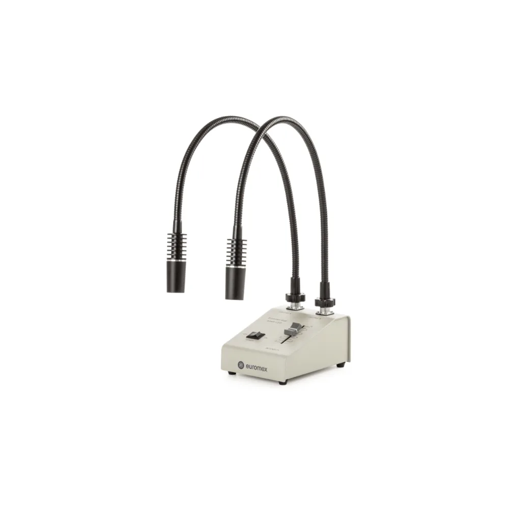 - Source lumineuse équipée de deux guides col de cygne autoportants, dotée de 2 LED blanches de 3 watts chacune, avec une température de couleur de 6500 K. Des options sont disponibles avec des LED UV de 365 nm ou des LED violettes de 395 nm ou 420 nm, également montées sur des guides col de cygne autoportants.