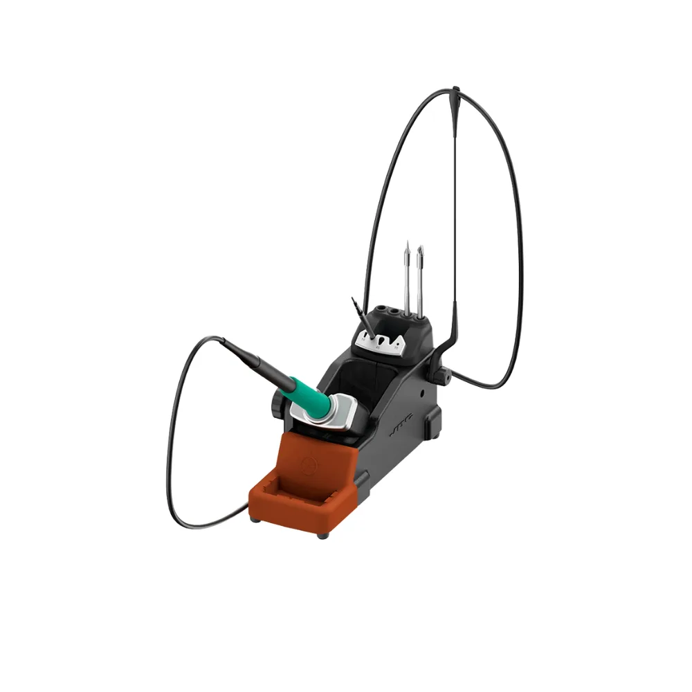 Le JBC Intelligent Heat Management du support de fer ADS détecte automatiquement l’outil dans le support et réduit la température de la panne en dessous du point de fusion de la soudure. Le mode hibernation coupe l’alimentation, empêchant ainsi l’oxydation. En conséquence, la durée de vie de la panne est multipliée par cinq. Le support comprend un nettoyeur de panne avec laine de laiton, ainsi qu’un pare-éclaboussures et une membrane anti-éclaboussures pour garder la zone de travail propre et exempte de particules de soudure. Le système d’échange rapide de pannes permet un échange sûr, facile et rapide, qui, combiné avec le support, permet de stocker jusqu’à quatre pannes.
